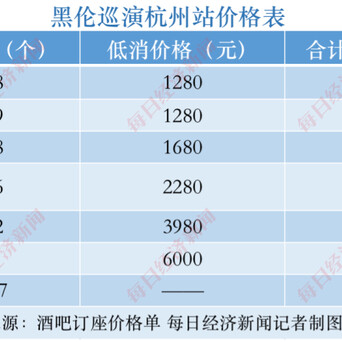 在已巡演的五场中,“黑伦”于杭州站的最高低消卖出了6000元,引发不少网友的关注,有人认为,这个价格已是周杰伦演唱会最高档2000元票价的3倍。且多地的酒吧店员声称,“黑伦场”的座位在演出当晚均会售罄。《每日经济新闻》记者获取了“黑伦”在3座城市的巡演价格单,按照全场售罄的低消价格来粗略计算,“黑伦”在佛山、苏州、杭州巡演当晚,承办方酒吧的收入分别高达19.8万元、24.1万元、33.1万元。